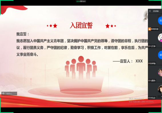 此次活动主要分为学习团的知识、青年运动的光辉历程、重温入团仪式三个部分。首先在各团支书的带领下,重温团的知识,巩固学习了团的性质、创立、组织象征等重要基本知识,着重了解团旗、团徽的正确用法与配置。其次通过视频学习的方式了解了青年运动的光辉历程,从五四运动逐步到如今抗击疫情,青年力量永不缺席。最后重温了入团仪式。