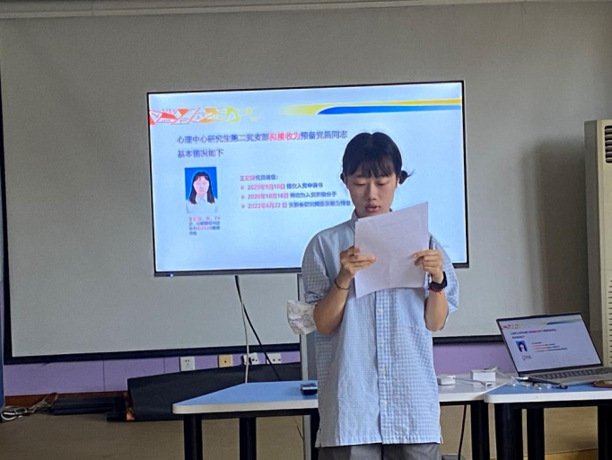 会议第一项议程,王纪婷、曾馨、徐霞霞依次宣读入党志愿书,表明了强烈的入党意愿和坚定的入党决心。紧接着三位同志的入党介绍人分别介绍申请人的情况并发表意见,随后赵海琳同志代表支委会提出支委会意见,同意接收王纪婷等3位同志为中共预备党员。议程末,3名拟接收为中共预备党员的同志回避,到场正式党员对是否接收王纪婷等3名同志入党进行了投票表决。