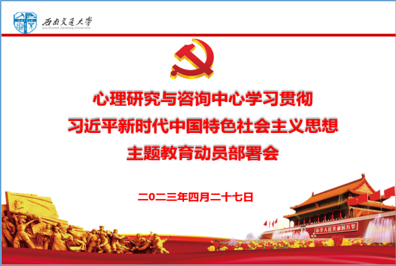 学习贯彻习近平新时代中国特色社会主义思想主题教育动员部署会于4月27日上午10:00在犀浦校区X5429召开,中心班子成员、党委委员、党支部书记、党员教师代表、辅导员参加会议。学校主题教育监督指导组第八组组长任新红同志莅临指导。
