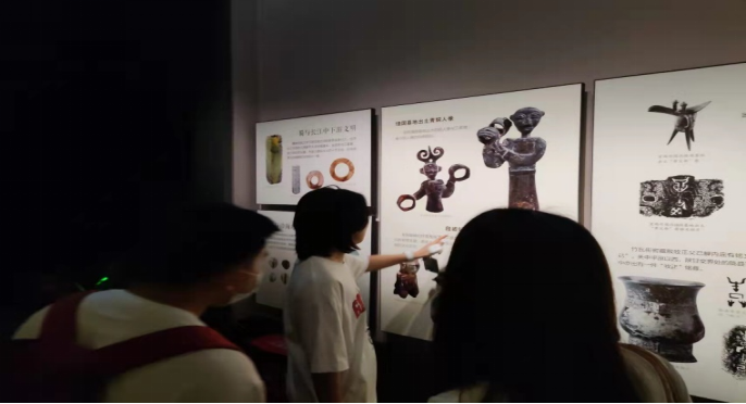 进入“古代篇”场馆,历史的厚重气息扑面而来,一件件展品仿佛诉说着历史的故事,从古城崛起到巍然王都;从史前城址郡到三星堆遗址,它们见证着古蜀文化的发展与巅峰。其中那些精美的历史文物、民俗文物、四川汉代画像石、画像砖、唐代佛教石刻、三星堆铜人、四川陶瓷、明清书画及工艺美术文物等给同学们留下了深刻印象。通过学习,大家了解到了成都从先秦时期到明清时期的各种历史文化,进一步提升了同学们对历史文化的感知。