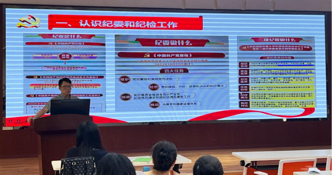 柯小君同志从“纪委是什么”“纪委做什么”“二级纪委怎么做”入手,引导大家认识纪委和纪检工作,让大家理解认识到纪检工作的意义和重要性。随后,柯小君同志结合《戒鉴Ⅱ——党的十九大以来学校查处违纪案例警示集》,引导大家学习我们身边的典型警示案例和重要启示,以此警示广大师生以案为鉴、防微杜渐、敬畏纪律、守住底线,清清白白做人,干干净净做事。