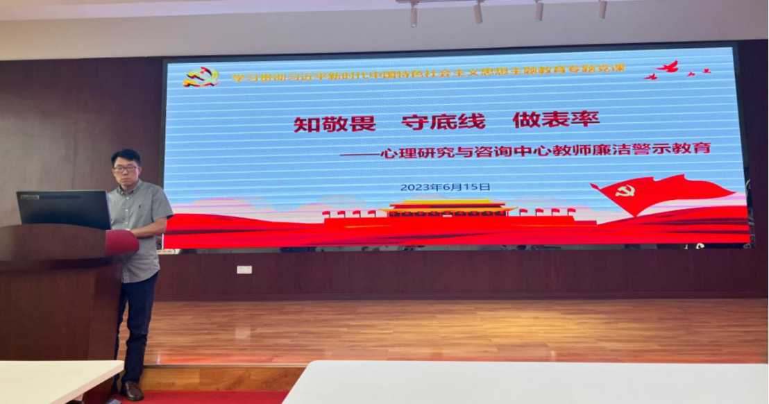 按照学校党委和中心党委有关主题教育的部署要求,为推动学习贯彻习近平新时代中国特色社会主义思想主题教育走深走实,党委副书记柯小君结合本职工作,在6月15日以“知敬畏 守底线 做表率”为题讲授专题党课。