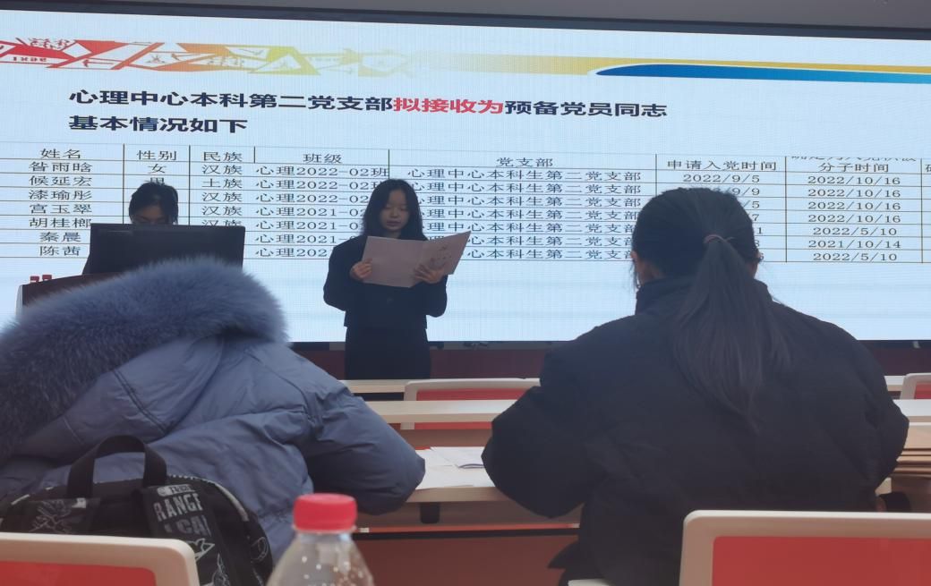 本科生第二党支部于2023年12月15日下午16时30分在X5501召开了支部大会,讨论关于接收昝雨晗、候延宏、漆瑜彤、胡桂榔、陈茜、宫玉翠、秦晨等七名同志为中共预备党员事宜。参加此次会议的有瓜子影视