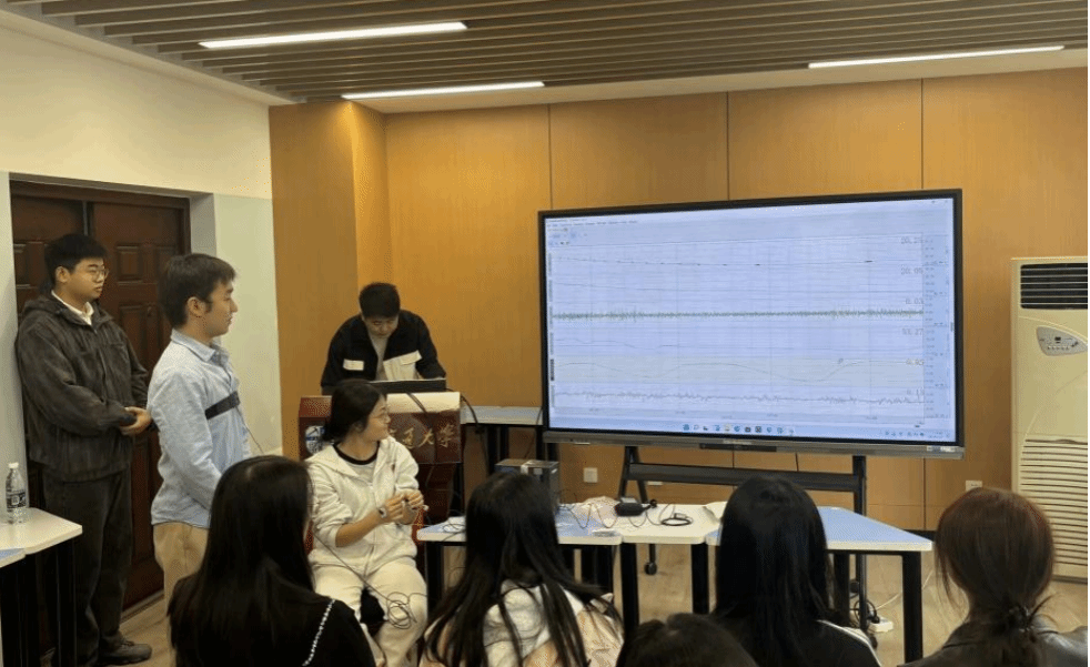 最后,老师邀请同学进行仪器使用的体验,带领同学们检查仪器、佩戴信号收集器、收集信号以及解读信号,使得参会同学在学习理论知识的基础上,进一步在体验与实践中掌握仪器使用。