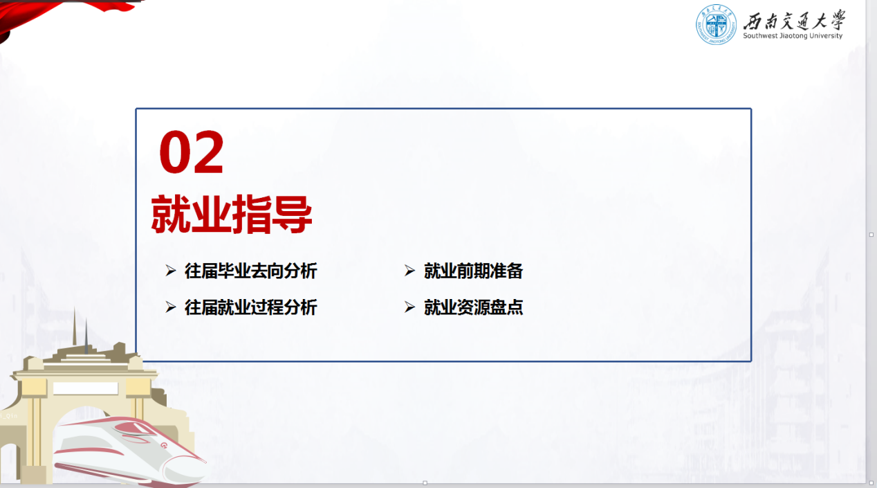 随后,樊菊老师从往届毕业去向分析、往届就业过程分析、就业前期准备和就业资源盘点四个方面去帮助同学调整求职状态,做好就业准备。