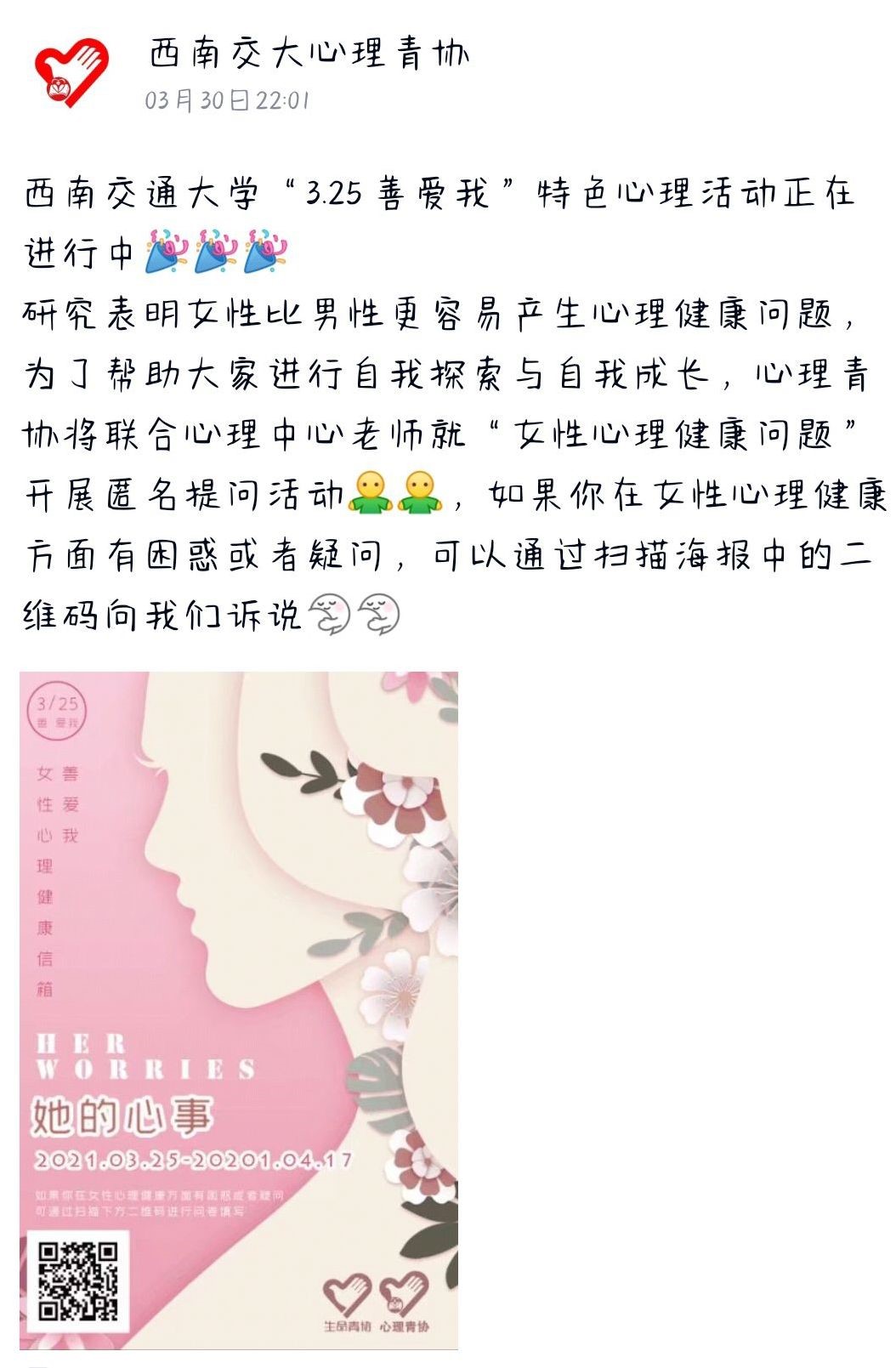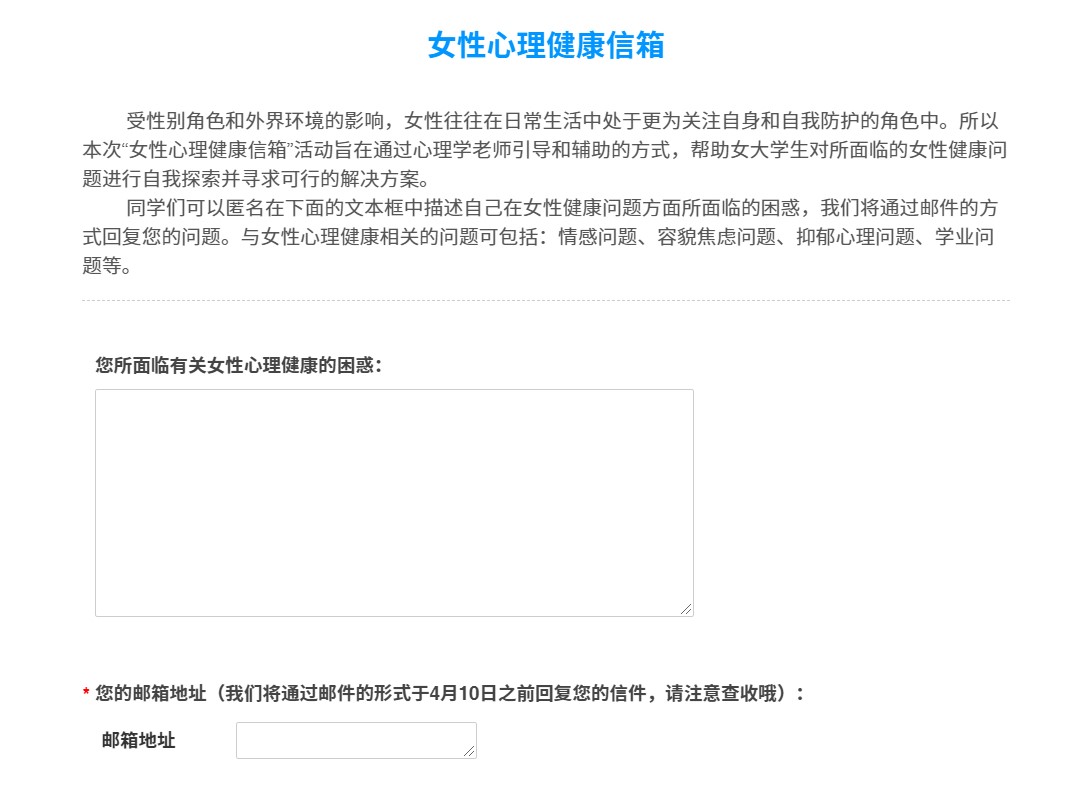 本次活动通过线上发放问卷的形式,收集同学们符合女性心理健康主题的问题、当前所面临的困境,整理分类后提交给具有咨询经验的老师和研究生。本次活动共向15名西南交大在读的女性学生提供了心理咨询。
