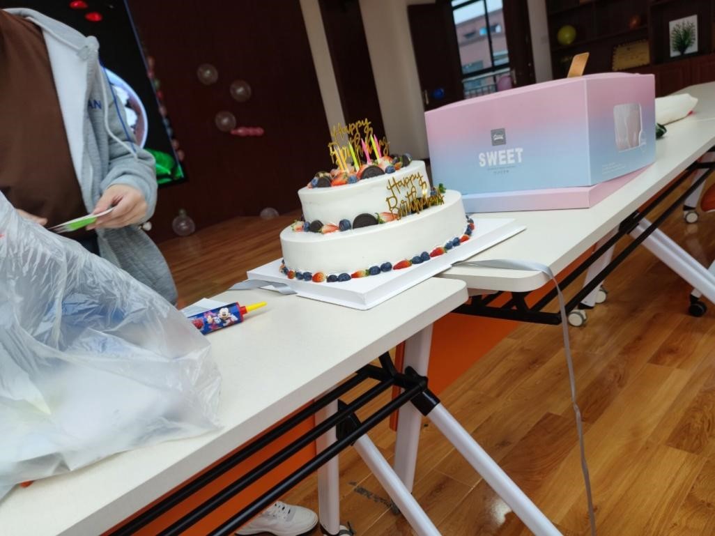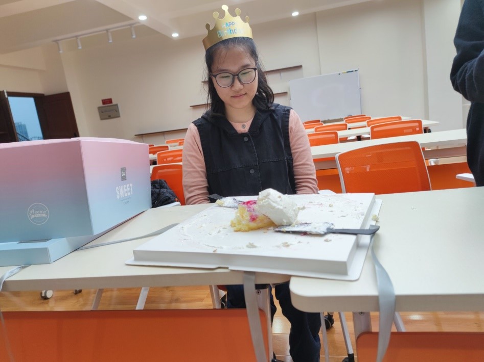 最后进行的是切蛋糕,分食蛋糕环节。寿星切下了第一刀,象征着对以后的生活的美好期盼,同学们吃蛋糕时也分享着寿星的快乐与好运,各位同学其乐融融,让活动的气氛走向顶峰,所有的同学都感受到生日会的温暖与幸福。