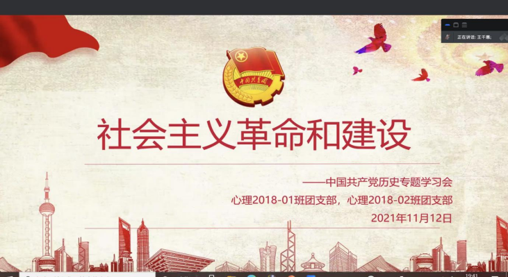 2021年11月12日晚,2018级应用心理1班及2班团支部就社会主义革命和建设时期历史专题召开党史学习会,会议由支部书记王千惠主持,全体同学参加会议,会议如期在线上举行。