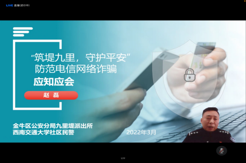 为落实校园防范电信网络诈骗工作,切实提升师生的安全防范意识,保障师生生命财产安全,2022年4月8日下午三点,瓜子影视 联同马克思主义学院特意邀请九里堤派出所、西南交大社区民警赵磊为师生讲解“防范电信网络诈骗”专题讲座。此次讲座以线上方式进行,中心本研全体学生参与。