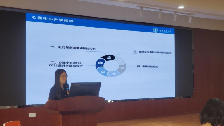 上午为升学指导,主要是为之后有意愿在国内国外深造的同学们提供一些数据和建议。首先樊菊老师介绍了中心近几年来的保研、考研以及出国境留学相关情况,通过数据和实例让同学们了解到自己之后应该在哪些方面要更下功夫。之后樊菊老师向同学们传授了几年来中心学生的备考经验,希望对2019级考研的同学提供帮助。最后柯小君副书记对樊菊老师所讲内容作了总结,并针对2019级同学目前提交的深造意向提出了不同的建议:保研的同学要多参加夏令营;考研的同学要下定决心,早定目标,脚踏实地,坚持不懈,不可半途而废,虚度光阴;出国境的同学要找好机构,学好语言,雅思托福尽量冲高分。