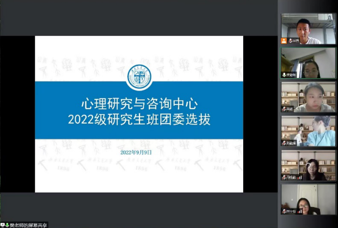2022年9月9日下午四点三十分,樊菊老师组织带领全体心理学研究生新生开展了2022级研究生班团委员选拔工作。由于疫情,选拔工作采用线上视频会议的形式,由候选人自愿参加竞选,同学们举手表决,为班集体选出理想的班团委员。