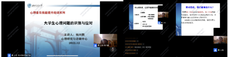 杨兴鹏老师,为本研各班心理委员、各年级辅导员老师以及2022级研究生开展“大学生心理问题的识别与应对”专题心理辅导,努力做到覆盖全体、关注全体、帮助全体,针对不同心理问题开展系统性、针对性的说明与解答,从而帮助心理委员、辅导员老师更准确地了解同学们的心理状况、更有侧重地识别和应对同学们的心理问题。