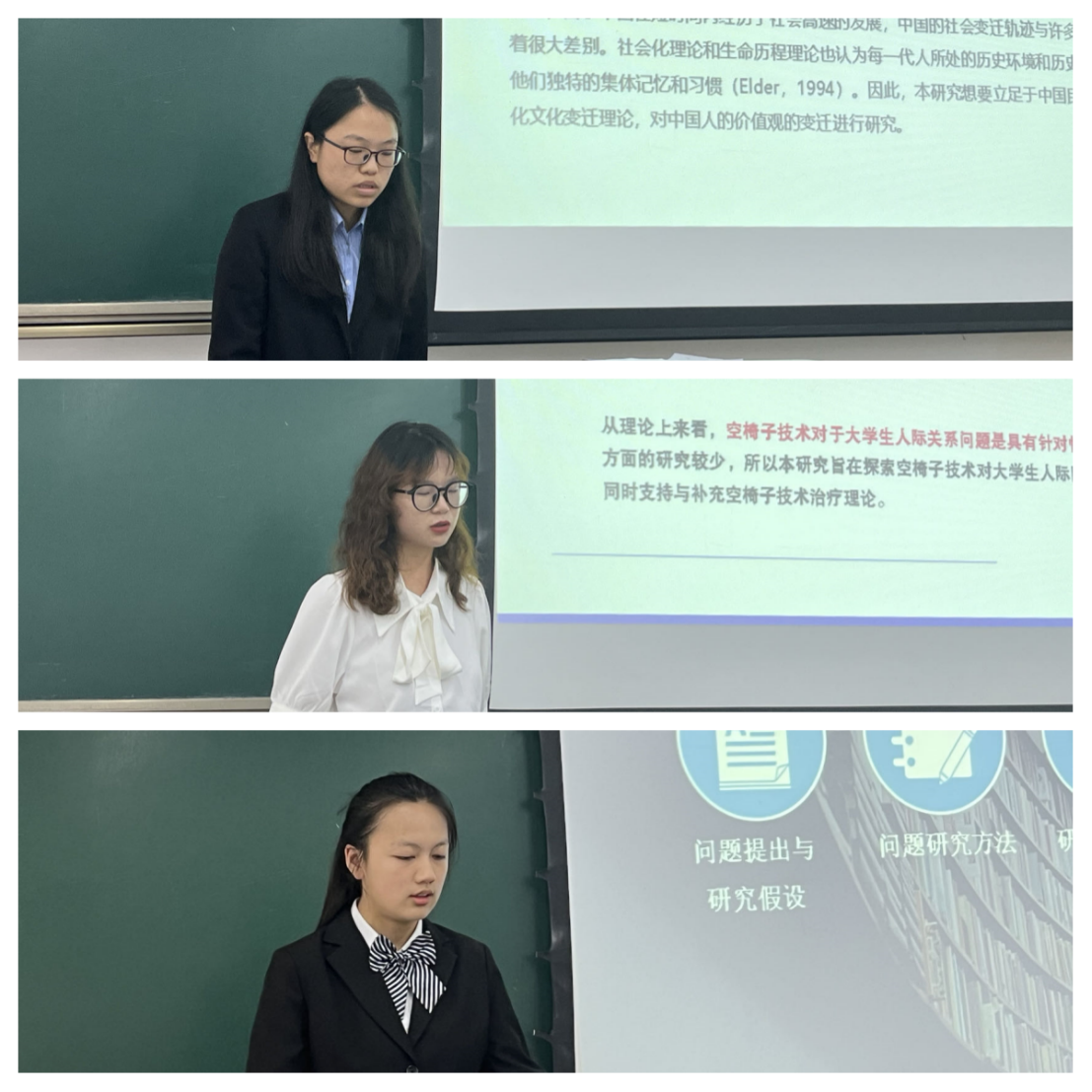 此次答辩采用分组形式,11个答辩小组按抽签顺序依次进行为时10分钟的答辩。各小组以严谨求实的态度总结汇报了本组所负责项目的研究情况,重点介绍了项目背景、研究方法、研究结果、不足与展望等。