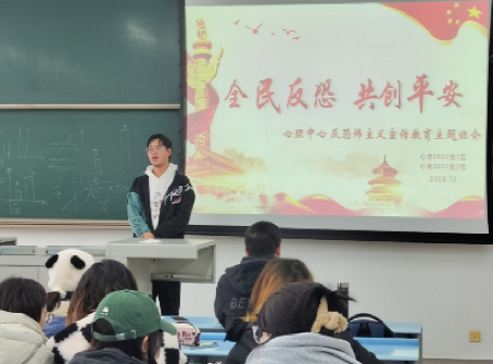 为持续提升大学生群体识恐、防恐、反恐的意识和能力,创造安全稳定的校园环境,2023年12月15日14:00在X2526开展“全民反恐 共创平安”反恐怖主义宣传教育主题班会。本次班会由班级安全委员谌龙同学主持,中心2022级本科生全体同学参会。