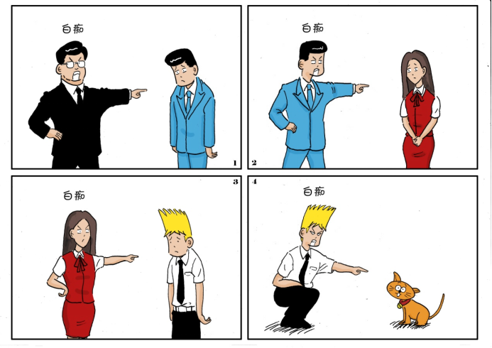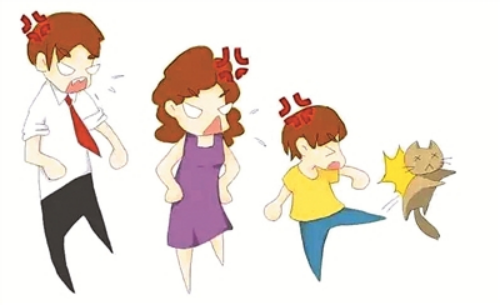 这就是心理学上著名的“踢猫效应”,描绘的是一种典型的坏情绪的传染,经过这样一条清晰的愤怒传递链条,最终的承受着,即“猫”,是最弱小的群体,也是受气最多的群体。