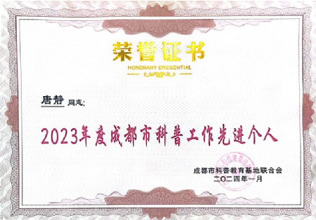 科普基地参加会议。会员代表大会通报了2023年工作和财务报告、2024年工作计划和财务预算,表彰了成都市科普工作先进个人、先进集体、优秀科普志愿者及队伍,为第二批成渝地区标准化科普研学基(营)地授牌。唐静老师作为2023年度成都市科普工作先进个人上台领奖。
