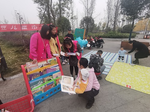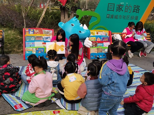 布置好活动场地后,参加本次活动的孩子和家长们也陆续到场。上午十点,故事小屋与豌豆市集活动正式开始。