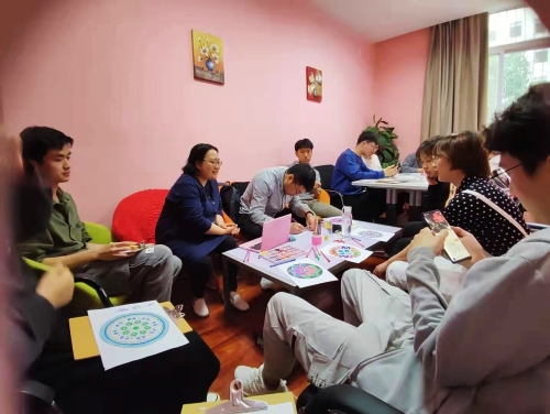 高老师先向大家介绍了何为心流体验,即在全神贯注、投入忘我的状态下感觉到的一种充满能量并且非常满足的感受。活动包含了编制中国结和彩绘曼陀罗两个环节。同学们积极参与、全神贯注投入到活动中,每个人都认真分享了自己的感受,包括自己最近的烦恼与压力和这次活动带给自己的感受。