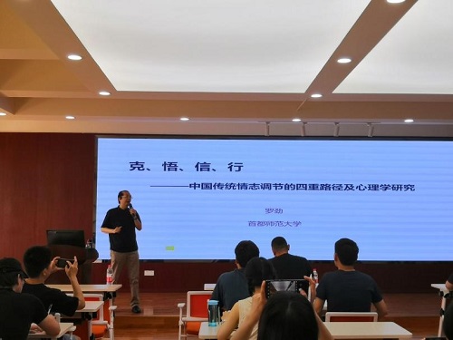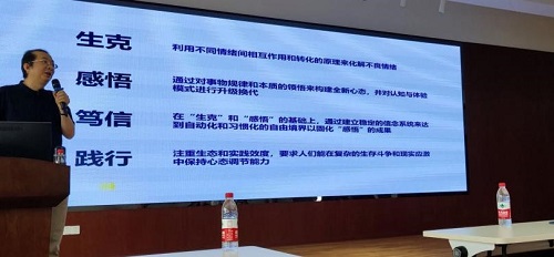 在讲座开始前,宁维卫教授向我们郑重介绍了罗劲教授,引起了同学们深深地兴趣。接着,罗教授用有关四川麻将的一个小故事开始了本次讲座,同时也强调心理学要将论文写在中国大地上。然后,罗教授对“克、悟、信、行”即生克、感悟、笃信、践行四个词语进行了提纲挈领的介绍,让我们对本次讲座的核心内容有了更详细的理解。