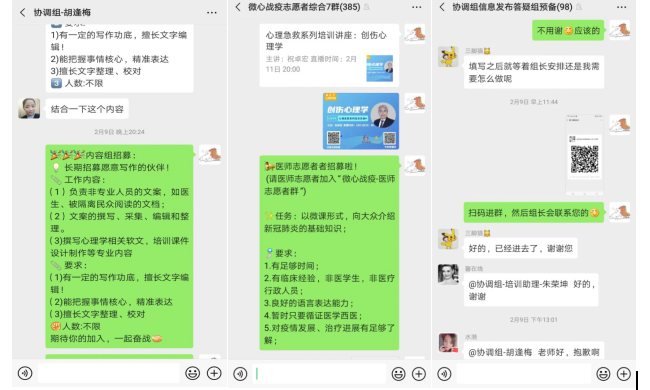 答:我参与的是“微心战疫”心理援助项目,该项目以线上咨询的方式支援灾区,为经历疫情而感到焦虑等不良情绪的人们进行心理援助。我的工作不是直接面向需要帮助的人,而是为加入给项目的志愿者进行培训,让他们能够尽快了解工作内容,尽快就位去帮助来咨询的人们。