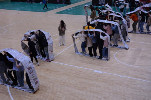 第二个团队竞赛是“无敌风火轮”,团队成员用报纸、透明胶制作团体成员比赛用的“风火轮”。全体成员站在风火轮之内,借助风火轮的滚动,顺利通过“危险区域”,以任务完成度和比赛时长最短作为胜出标准。大家做出的“风火轮”富有巧思,除了不同的组合方式,也使用了胶带加固。最后,大家用这个齐心协力、精心制作的作战工具开始比赛,比赛中出现了“风火轮”破损、但是胶带已经用光的情况,大家创造性地使用了志愿者分发的农夫山泉上的贴纸修补,坚持完成了比赛。