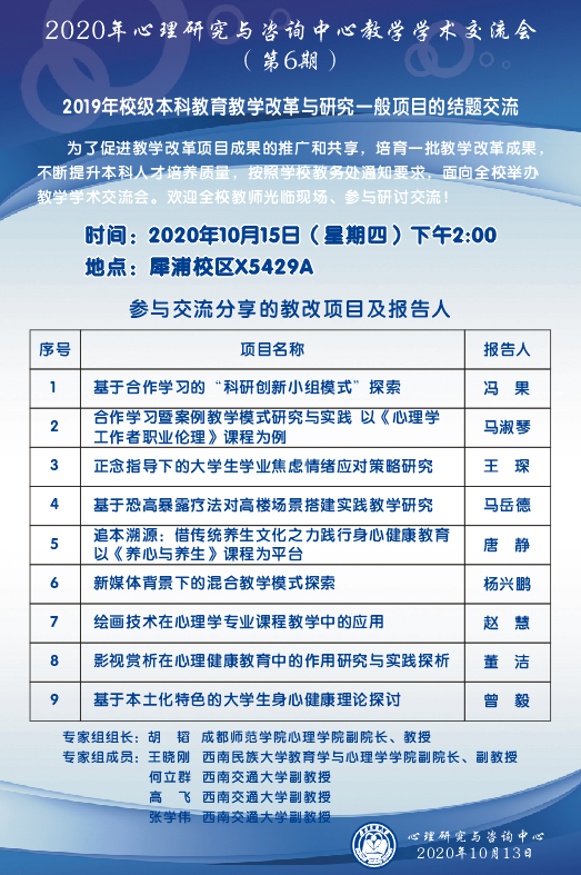 于2020年10月15日在X5429面向全校师生召开结题交流会。7项2019年度校级教改项目、2项院级教改项目负责人参加了交流研讨会。