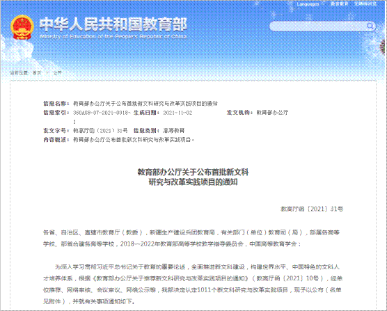 2020年11月,教育部新文科建设工作组在山东大学召开新文科建设工作会议,发布了《新文科建设宣言》,对新文科建设作出了全面部署。2021年3月学校教务处启动了新文科研究与改革实践项目的申报工作。中心主动对接,由宁维卫教授牵头,组织相关老师积极申报。