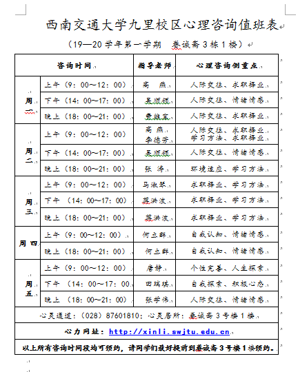 瓜子影视 2019-2020学年第一学期心理咨询值班表