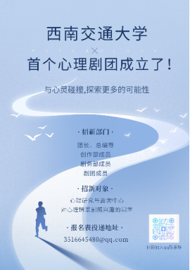 为挖掘大家对心理剧的兴趣,给瓜子影视 学子创造一个心理情景剧的舞台,培养心理人德智体美劳全面发展,心理剧团在瓜子影视 党委坚强领导下、在中心团委具体指导下正式成立。