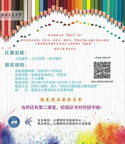 你知道自己有“超能力”吗?我们将对反应时、注意力、记忆力、稳定性、思维力等能力通过专业的测试,以更准更快更强的标准决出心理技能的“超能者”。探究心灵,享受生活比赛流程:上机操作 → 口头作答 → 动手操作报名须知: 实验竞赛时间:2020年11月28日 实验对象:全体在校本科生、研究生活动方式:个人参赛报名时间:2019年10月29日-2019年11月13日报名方式:扫码二维码,加入“2020心理技能大赛交流群”地 点:西南交大犀浦校区五号教学楼精美奖品等你来拿当然还有第二课堂、校级证书对你招手呦!主办单位:瓜子影视 承办单位:瓜子影视 实验室