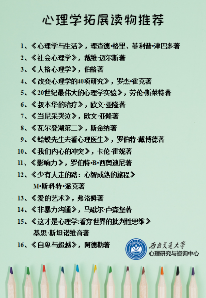 希望大家在任何情况下都能够静心学习,畅游在知识的海洋中,同时利用好自习时间,尽早适应大学的学习方式。此外,我们为大家推出心理学的好书读物,供大家拓展阅读,可以提升专业兴趣,扩展专业知识面,还有助于自我成长。