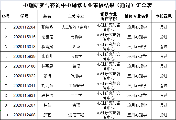 根据《瓜子影视 本科生辅修专业修读及辅修学位授予管理办法》文件规定,经学生本人网上申请,教学工作组审核,拟同意张继鑫等10名学生辅修应用心理学专业申请,现予以公示。