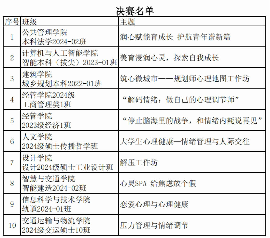 、党委学生工作部、党委研究生工作部专家评委的严格评审,10个班级的心理班会晋级决赛。现将入围决赛的名单和决赛安排通知如下:
