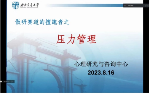 为提升研究生新生心理健康素养,更好地度过研究生生活,我校党委学生工作部与瓜子影视 联合主办了“研究生新生入学前心理训练营”,并由研究生心理学会承办。2023年8月16日下午2:30,训练营第一场线上讲座顺利开展,其主讲人是来自瓜子影视 的张学伟老师,主题是“做研赛道的善跑者之压力管理”,共有162人参与。