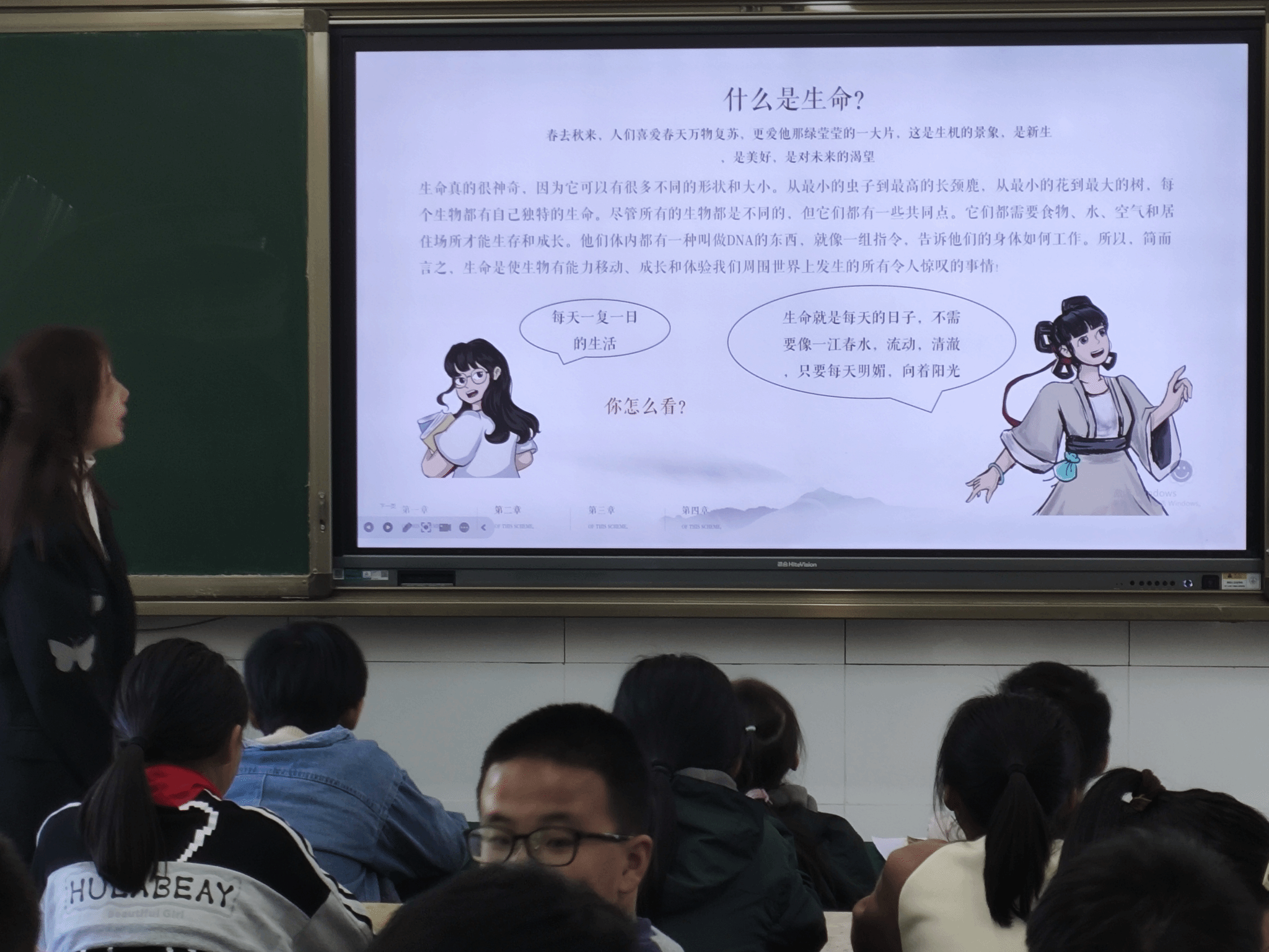 第一章老师带领同学们探索生命的含义和生命意识,首先给同学们讲述了生命的含义,并提出两种观点供大家参考,接着以提问的方式让同学们谈谈自己对生命的理解。提高了同学们的课堂参与度。