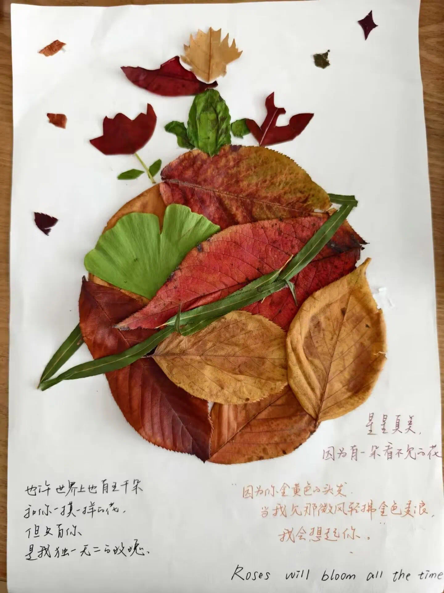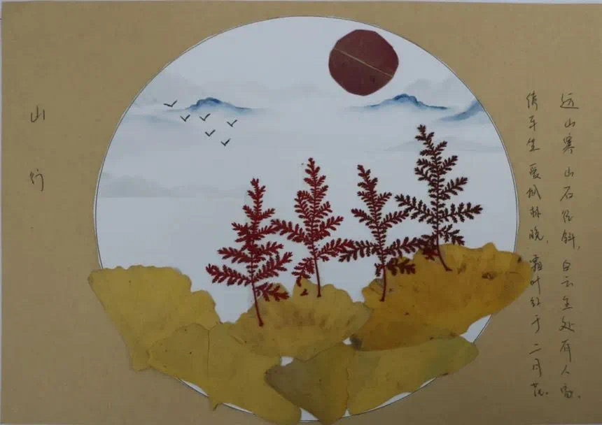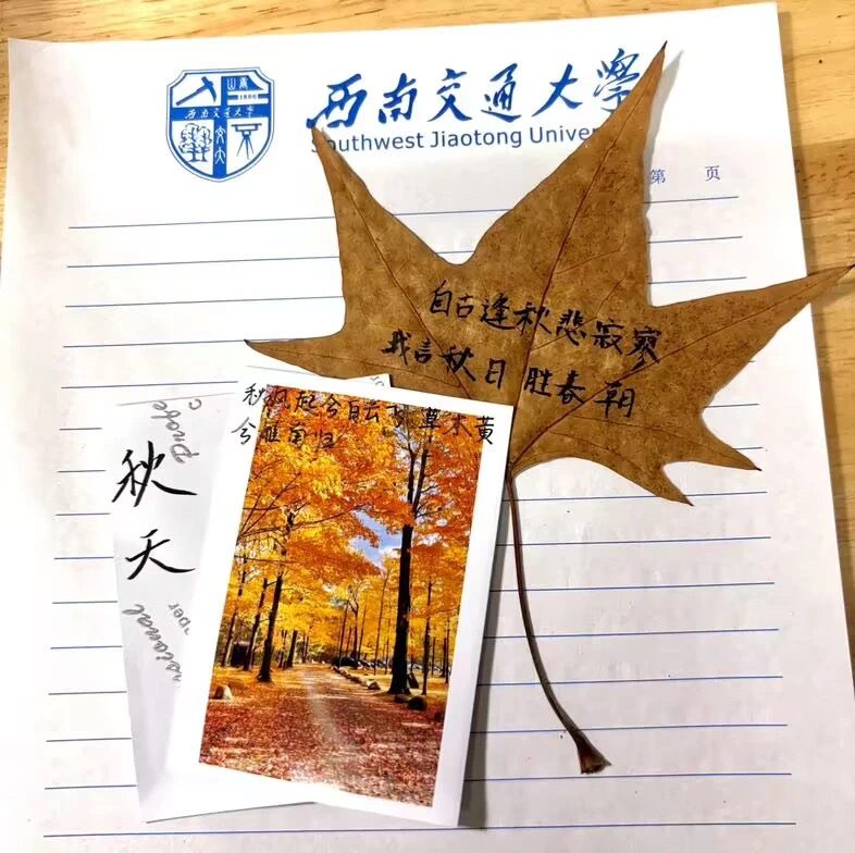 本次活动以“春华秋实”为主题,鼓励同学们从秋冬季节或四季中的任意一个或多个季节入手,通过季节的意象物体,如落叶、雪花、春花、夏阳等,制作成贴画,并配以文字,抒发自己的心情或感受。